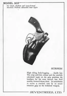 - U.S. Patent 3,777,952 Secure holster for revolvers (A holster to be carried high on the hip and having a trigger guard pocket, a muzzle pocket, and a breakfront flap which cooperate to prevent removal of the revolver from the holster.), filed January 3, 1972, issued December 11, 1973