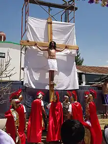 One of the more popular Senákulo is Ang Pagtaltal in Jordan, Guimaras, which began in 1975 and draws some 150,000 visitors annually.[44] Some people perform crucifixions outside of Passion Plays to fulfill a panatà (vow for a request or prayer granted), such as the famous penitents in Barangay San Pedro Cutud, San Fernando, Pampanga.