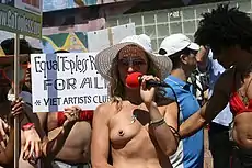 In parts of the United States, erotic dancers wear pasties in strip clubs to avoid prosecution under local public indecency laws. In extreme cases, liquid latex pasties are used to comply with local laws, raising criticism by strippers that lawmakers are engaging in cruelty by requiring use of adhesive material on the nipple.[1] Pasties are worn by many neo-burlesque performers and are also found in night clubs, fetish parties and parades, such as pride parades.