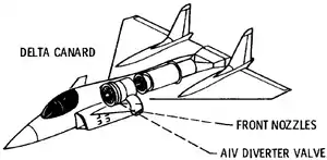 Inspired by the General Electric CJ805-23 aft-turbofan[13] and the Rolls-Royce tandem-fan,[3][14] an appropriate system seemed to be a dual thrust system with a lift vector at the front and a swivel nozzle at the back for the jet engine, counterbalancing each other.