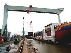 The first ship constructed entirely in the shipyard was a small passenger ferry named Elbphilarmonie for Hadag Hamburg.[3] In addition, repair services for Hamburg ferries and barges were developed. A second ferry named Kehrwieder was also completed in 2018. Since then, several ships' sections have been made for the Meyer shipyard in Papenburg for large cruise ships, and modular sections for a passenger ferry on Lake Constance.[4][5]