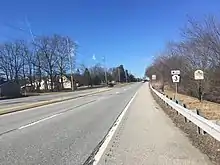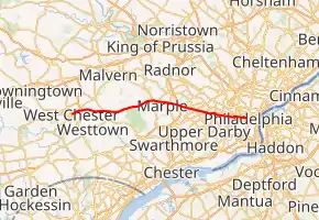 In 1954, regular trolley service between Philadelphia and West Chester ended as plans were made to widen PA 3. Trolley service during peak periods continued until 1958.[6] The trolley service was replaced by buses, which is today part of SEPTA's Route 104 service.[6][16] During the mid 1950s and early 1960s, the West Chester Pike portion of PA 3 was widened into a four-lane road.[6] US 202 and PA 3 were routed onto a one-way pair in West Chester along Market and Gay streets by 1959.[17] By 1960, PA 3 was rerouted to follow Cobbs Creek Parkway and Baltimore Avenue to end at US 13 at the intersection of Baltimore and Whitby avenues in Southwest Philadelphia.[18] The route was realigned to follow Chestnut and Walnut streets to US 13 at 44th and 43rd streets by 1970.[19] Also by this time, the US 202 concurrency in West Chester was removed as that highway was rerouted to bypass the borough to the east along US 322.[20] PA 3 was extended east to PA 291 and PA 611 at Philadelphia City Hall during the 1970s. The route followed Chestnut and Walnut streets to US 13 at 38th Street before running along Chestnut Street eastbound and Market Street westbound to 30th Street Station, where it shifted to Market Street eastbound and John F. Kennedy Boulevard westbound.[21]