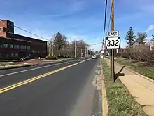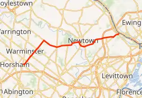 Pennsylvania Route 332 (PA 332) is a state highway in the U.S. state of Pennsylvania. The route runs 17.5 miles (28.2 km) from PA 263 in Hatboro, Montgomery County east to PA 32 in Yardley, Bucks County. PA 332 runs through suburban areas to the north of Philadelphia, serving Warminster, Ivyland, Richboro, and Newtown. The route is two lanes wide most of its length, with the bypass around Newtown a four-lane divided highway. PA 332 intersects PA 132 in Warminster, PA 232 in Richboro, PA 413 and PA 532 in Newtown (all three run concurrently on the Newtown Bypass), and Interstate 295 (I-295) in Lower Makefield Township.