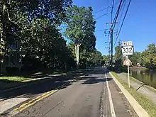 Upon intersecting Lindenhurst Road/Campus Drive north of the Newtown Campus of Holy Family University, the route enters Lower Makefield Township and becomes Newtown Yardley Road. The road passes through farmland before heading north of an office park and reaching an interchange with I-295. Following this interchange, PA 332 becomes a two-lane undivided road and intersects Mirror Lake Road before it enters residential areas and crosses Buck Creek. The route reaches a junction with Yardley Langhorne Road and turns northeast onto Afton Avenue. PA 332 crosses into the borough of Yardley, where it is known as West Afton Avenue. The road heads into the downtown area and crosses Main Street, where the road name changes to East Afton Avenue, and the Delaware Canal. PA 332 comes to its eastern terminus at an intersection with PA 32, which runs along the west bank of the Delaware River.[3][5]