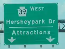 Pennsylvania Route 39 (PA 39) is a 17.83 miles (28.69 km) state highway located in Dauphin County, Pennsylvania, United States. PA 39 begins at North Front Street near Harrisburg and ends at U.S. Route 322 and U.S. Route 422 near Hummelstown and Hershey. The route passes through the northern and eastern suburbs of Harrisburg and passes by Hersheypark, Giant Center, as well as the primary production factory for The Hershey Company. Between Harrisburg and Manada Hill, it is known as Linglestown Road, from Manada Hill to Hershey as Hershey Road and from Hershey to near Hummelstown and Hershey as Hersheypark Drive. Prior to the establishment of PA 39 in 1937, PA 39, had previously been designated as a route in northeastern Pennsylvania during the 1920s. That designation was deleted when it was renumbered US 11. As a result, PA 39 is one of a few routes which has a set of child routes which are no where near the primary route.