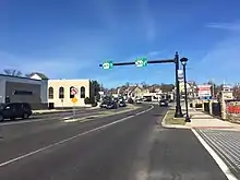In the 1930s, US 611 was realigned to follow Delaware Drive between Martins Creek and Portland, replacing the entire length of PA 827. The former alignment of the route between Martins Creek and Mount Bethel via Bangor was designated as PA 712; this road is now unnumbered Main Street and Lower South Main Street between Martins Creek and Bangor and PA 512 between Bangor and Mount Bethel. US 611 and PA 612 switched alignments between Delaware Water Gap and Stroudsburg in the 1930s, with US 611 realigned to follow Foxtown Hill Road and Park Avenue between Delaware Water Gap and Stroudsburg and PA 612 designated to follow the former alignment of US 611 between Delaware Water Gap and Stroudsburg via East Stroudsburg along Broad Street, Brown Street, Prospect Street, Ridgeway Street, Bridge Street, and Main Street.[22] By 1940, US 611 was extended north along US 11 to follow Green Ridge Street, Main Avenue, and Market Street to end at US 6 at Keyser Avenue in Scranton.[23] In the 1930s, US 611 was widened into a multilane road across the Neshaminy Creek, between south of Doylestown and Plumsteadville, between US 46 in Portland and Slateford, between Delaware Water Gap and south of Stroudsburg, from a point north of the PA 507 intersection north to the newly constructed PA 307 in southern Lackawanna County, and between south of Dunmore and Scranton.[22] During the 1940s, US 611 was upgraded to a multilane road between Philadelphia and south of Doylestown, between south of Stroudsburg and north of the PA 507 intersection, and along a short stretch to the north of PA 348 in Lackawanna County.[24] By 1950, US 611 was realigned to bypass Pipersville to the west, with the former alignment becoming Old Easton Road. By this time, the route was also shifted west to a new alignment between north of PA 113 and north of Ottsville, with the former alignment becoming Durham Road.[25] US 611 was extended further north along US 11 to end at US 6 at the northern edge of Scranton in the 1950s. In the 1950s, PA 291 replaced the PA 191 designation along Broad Street between Moyamensing Avenue and US 611 at Philadelphia City Hall.[26] In the 1950s, US 611 was upgraded to a divided highway between Philadelphia and PA 63 in Willow Grove, between Scotrun and PA 196 in Mount Pocono, and along a short stretch south of PA 490 in Tobyhanna.[27] The section of US 611 between PA 590 in Elmhurst and Dunmore was improved to a divided highway in 1958, with the section of the route leading into Dunmore moved to a new alignment.[27][28]