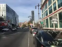 Past Penn Square, PA 611 continues north along six-lane divided Broad Street through more commercial development and high-rise buildings in Center City. The road passes to the west of the Pennsylvania Convention Center between Arch Street and Race Street and to the east of the former Hahnemann University Hospital between Race Street and Vine Street. At Vine Street, the route comes to an interchange with I-676/US 30 (Vine Street Expressway), with access provided by the Vine Street frontage road. Roman Catholic High School is located east of the road just north of Vine Street. Following this, PA 611 passes more commercial development and crosses Spring Garden Street before heading east of Benjamin Franklin High School. The road heads out of Center City and into North Philadelphia. The route continues north as a four-lane road with alternating divided and undivided stretches through urban residential and commercial development, crossing Ridge Avenue/Fairmount Avenue and Girard Avenue, the latter of which carries SEPTA's Route 15 trolley line. The road crosses Cecil B. Moore Avenue as it heads through the Temple University campus, passing to the east of the Liacouras Center multi-purpose arena between Cecil B. Moore Avenue and Montgomery Avenue. PA 611 leaves the university campus at the Diamond Street intersection and runs past more urban homes and businesses, crossing Dauphin Street. At the Lehigh Avenue intersection, the road passes over SEPTA's Main Line near the North Broad station. After crossing Glenwood Avenue, the route passes under Amtrak's Northeast Corridor east of the North Philadelphia station serving Amtrak and SEPTA's Trenton Line. PA 611 heads into the Nicetown–Tioga neighborhood and intersects Allegheny Avenue and Westmoreland Street/Rising Sun Avenue before it passes to the west of Temple University Hospital between Ontario Street and Tioga Street. The road continues through urban areas as a five-lane road with a center left-turn lane and intersects Erie Avenue and Germantown Avenue before passing over Conrail Shared Assets Operations' Richmond Industrial Track line south of Lycoming Street. The route crosses Hunting Park Avenue before it comes to a junction with US 13 (Roosevelt Boulevard), where left turns are prohibited. A short distance later, PA 611 reaches a partial interchange with US 1 (Roosevelt Expressway), with access to southbound US 1 via Cayuga Street and from northbound US 1 via St. Lukes Street. The missing movements to and from US 1 are provided by US 13.[3][4]