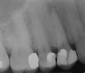 | Radiograph showing bone loss between the two roots of a tooth (black region). The spongy bone has receded due to infection under tooth, reducing the bony support for the tooth. | |