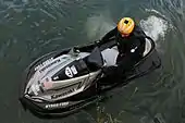 Apart from the obvious hazards of collisions and mechanical breakdowns common to all vehicles, operating or riding a PWC can involve a risk of orifice injuries.[15][16] These injuries are typical of the kinds of injuries that waterskiers experience as a result of falling into the water at speed.[17] Such injuries can occur from simply falling in the water at speed or they can occur from the output end of the pump jet. A rider who falls (or is ejected) off the back can land directly in the path of the PWC's high-pressure jet of water. Unless a rider is appropriately dressed in garments made out of a strong, thick substance like neoprene (as is commonly found in wetsuits), the jet may penetrate any orifice it reaches. All major PWC manufacturers warn about this risk and recommend that passengers wear wet suit bottoms or equivalent protection. The American Waterski Racing Association recommends that all of their racers wear wet suit bottoms for this same reason.