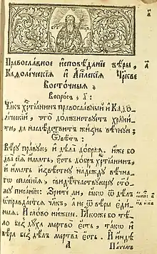 For over 20 years, Mogila played a leading role in Ukraine’s book printing.[8] He was one of the first to print in the Ukrainian language. Mohyla and his followers at the Lavra and the Mohyla collegium made the first steps in formulating the fundamentals of the modern Russian and Ukrainian languages. The proliferation of the Ukrainian language in print was part of a wider effort of Ukraine’s struggle for sovereignty and cultural self-preservation. Mohyla wanted to preserve the Ukrainian nation’s identity that had been experiencing enormous pressure from the Polish and Lithuanian regimes. He initiated the publication of sermons for the laity in Ukrainian, Biblical texts in Church Slavonic, and scientific books in Ukrainian, Polish, Greek, and Latin. Mohyla wrote several books which were distributed in Ukraine, Belarus, Poland, Muscovy, Romania, and Georgia. One of his most important publications was the first Orthodox Catholic Catechesis worldwide (1640), written by him on the request of all Orthodox Catholic churches. After it was approved by several Ecumenical Patriarchs of Constantinople it became the foundational document for the Church doctrine in the orthodox world.[9][10]:106 During the 17th and 18th centuries, this book had 25 editions. His other notable works included Trebnyk or Euchologion (1646). It resembled an encyclopedia in which all Ukrainian church rites and services were systematized. In this, he did much to preserve the purity of Orthodox ritual.[11]
