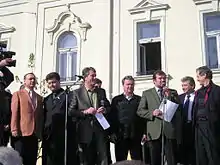 Ukrainian President Yushchenko nominated Poroshenko for Foreign Minister on 7 October 2009.[42][43] Poroshenko was appointed by the Verkhovna Rada (Ukraine's parliament) on 9 October 2009.[44][45] On 12 October 2009, President Yushchenko re-appointed Poroshenko to the National Security and Defense Council.[46] Poroshenko supported Ukrainian NATO-membership. However, he also stated NATO membership should not be a goal in itself.[47] Although Poroshenko was dismissed as foreign minister on 11 March 2010, President Viktor Yanukovych expressed hope for further cooperation with him.[21]