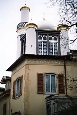 He also tried introducing silkworm culture in Switzerland in 1837, but the silkworms were destroyed during an epidemic in 1843.[10] As a result of his travels in the Middle East, he had an addition to his home built, topping it with minarets.[11]