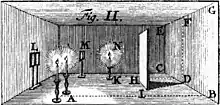 Lambert's book is fundamentally experimental. The forty experiments described in Photometria were conducted by Lambert between 1755 and 1760, after he decided to write a treatise on light measurement. His interest in acquiring experimental data spanned several fields: optics, thermometry, pyrometry, hydrometry, and magnetics. This interest in experimental data and its analysis, so evident in Photometria, is also present in other articles and books Lambert produced.[9] For his optics work, extremely limited equipment sufficed: a few panes of glass, convex and concave lenses, mirrors, prisms, paper and cardboard, pigments, candles and the means to measure distances and angles.