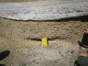 Hyalotuff is a type of rock formed by the explosive fragmentation of glass during phreatomagmatic eruptions at shallow water depths (or within aquifers). Hyalotuffs have a layered nature that is believed to be a result of dampened oscillation in discharge rate, with a period of several minutes.[3] The deposits are much finer grained than the deposits of magmatic eruptions, due to the much higher fragmentation of the type of eruption. The deposits appear better sorted than magmatic deposits in the field because of their fine nature, but grain size analysis reveals that the deposits are much more poorly sorted than their magmatic counterparts. A clast known as an accretionary lapilli is distinctive to phreatomagmatic deposits, and is a major factor for identification in the field. Accretionary lapilli form as a result of the cohesive properties of wet ash, causing the particles to bind. They have a circular structure when specimens are viewed in hand and under the microscope.[1]