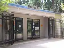 The Southwest corner has Pier Pool, which is open in the summer season.[6] The park was dedicated in 1940, including the pool. The first swimmer was the reigning Junior Rose Festival Queen.[7] The pool was closed by the City Council, but received federal funding in Spring 2007 to be reopened in 2008.[8]