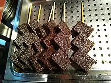 Pig's blood cake (Chinese: 豬血糕; pinyin: zhū xiě gāo; Pe̍h-ōe-jī: ti-hoeh-ko or 豬血粿; zhū xiě guǒ; ti-hoeh-koé) is a blood pudding served on a stick as street food in Taiwan. Its alternative name is black cake. It is made with steamed pork blood, sticky rice and then coated in peanut powder with dipping sauces. Pig's blood cake came from Fujian to Taiwan and then developed.[1] It is eaten as a snack. It can also be cooked in a hot pot. It is served hot by street vendors who keep it warmed in a wooden box or metal steamer.[2] A description from Seriouseats described it as cross between a rice cake and mochi.[2]