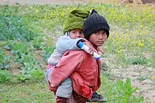 A person carrying someone else on their back is most commonly seen in the modern day in the form of a parent carrying a child. It may also feature in the context of play or sport, and evidence of this dates back to Ancient Greece where games involving piggyback riding were combined with the requirement of catching or throwing a ball.[11]