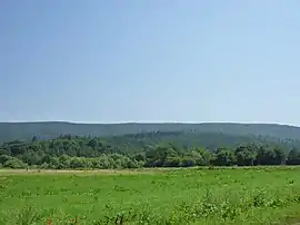The tallest mountain in the Beskid Dukielski,[3] Piotruś is relatively flat-structured, giving it its alternative name of Płazyna.[4] The mountain is crescent-shaped, aligned roughly north-south. It is bounded to the west and south by the valley of the Jasiołka river, separating it from Ostra Mountain to the south.[2] The mountain is covered in forest, primarily old beech trees, and near the top, in birch, European mountain-ash and alder.[3] A spruce forest on Piotruś's western slope was mostly destroyed in a fire during the interwar period. A yellow sandstone rock is prominently displayed at the top of the mountain, which likely contributed to its name (Piotr – Polish for Peter – also means stone). Some of it was excavated for buildings, and several unused large blocks can be found.[4]
