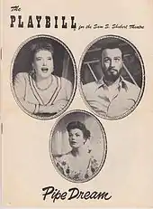 Pipe Dream premiered on Broadway on November 30, 1955, at the Shubert Theatre, with Helen Traubel as Fauna, William Johnson as Doc, Judy Tyler as Suzy, George D. Wallace as Mac and Mike Kellin as Hazel.[21] The show had received the largest advance ticket sale in Broadway history to that point, $1.2 million.[29] Some of Steinbeck's ill-feeling was removed on the second night, which he attended and then went backstage to greet the cast. After a celebratory dinner at Sardi's during which the manager sent champagne to his table, he said to his wife Elaine, "Isn't the theatre marvelous?"[30] The author held no grudge; he later told Hammerstein that he accepted that Rodgers and Hammerstein were ultimately responsible for the show and had the right to make changes.[29]