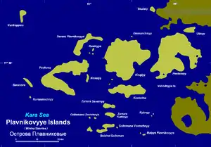 The Plavnikovye Islands should not be confused with Plavnikovy Island (Ostrov Plavnikovy), off the western shores of Severnaya Zemlya, also in the Kara Sea.
