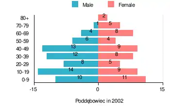 According to the 2002 Poland census, there were 129 people residing in Poddębowiec village, of whom 52.7% were male and 47.3% were female. In the village, the population was spread out, with 31% under the age of 18, 37.2% from 18 to 44, 16.3% from 45 to 64, and 15.5% who were 65 years of age or older.[1]