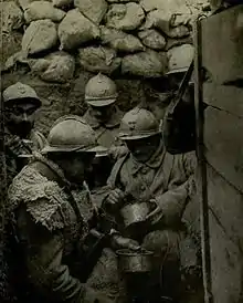 Poilu (/ˈpwɑːluː/; French: [pwaly])[1] is an informal term for a French World War I infantryman, meaning, literally, hairy one. It is still widely used as a term of endearment for the French infantry of World War I. The word carries the sense of the infantryman's typically rustic, agricultural background. Beards and bushy moustaches were often worn. The poilu was particularly known for his love of pinard, his ration of cheap wine.[2][3]