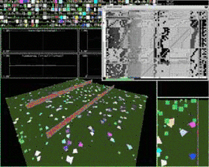 It uses the Qt graphics toolkit and OpenGL to display a graphical environment in which a population of trapezoid agents search for food, mate, have offspring, and prey on each other. The population is typically only in the hundreds, as each individual is rather complex and the environment consumes considerable computer resources. The graphical environment is necessary since the individuals actually move around the 2-D plane and must be able to "see." Since some basic abilities, like eating carcasses or randomly generated food, seeing other individuals, mating or fighting with them, etc., are possible, a number of interesting behaviours have been observed to spontaneously arise after prolonged evolution, such as cannibalism, predators and prey, and mimicry.