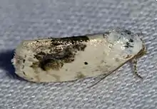 The wingspan is 16–20 mm. The forewings are white with large diagonal blackish patch in the distal half. The hindwings are whitish, basally with greyish-brown shading distally. Adults are on wing from May to September.