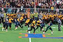 In the United States and Canada, powderpuff football games are flag football or touch football games between girls from junior and senior classes or cross-town school rivals. Funds from the ticket and concession sales for the game typically go to charity, the senior class, or to a dance. The games are an annual tradition at many high schools and universities. The term originates from the powder puff, the soft material used for the application of cosmetic face powder. The games usually occur before homecoming.