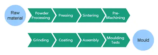 - Pressing: This step does the pre-forming of "green" raw bodies of the mould inserts.