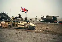 Under United Nations Security Council Resolution 678, Iraq was given a deadline of 15 January 1991 to withdraw from Kuwait.[449][440][450] The deadline passed with Iraqi forces still occupying Kuwait, and an air campaign was launched by US and coalition forces on 16 January, with the ground war beginning on 24 February.[277][451] The swift campaign was successful and a ceasefire was declared on 28 February, with Iraqi forces pushed over the border and the conflict contained with the immediate region, despite Iraqi attempts to draw Saudi Arabia and Israel into the conflict.[452][453] Despite the largely one-sided nature of the conflict, 47 British troops were killed, and enormous environmental damage was caused as retreating Iraqi forces set fire to Kuwait's oilfields.[454][277][455] The allied troops did not push on to Baghdad and remove Hussein, as this was not endorsed by the UN resolution;[456][457][448] there were hopes that a internal revolts would succeed in unseating him, however these were brutally crushed and Hussein remained in power.[458][459][nb 13] A series of sanctions were placed on Iraq, and Major pushed for the creation of no-fly zones in southern and northern Iraq, thereby enabling Kurdish forces in the north to establish a de facto autonomous zone and avoiding further massacres.[461][462][463] Within Britain, a national thanksgiving service to commemorate those who had died in the conflict was held at Glasgow Cathedral in May 1991.[464]