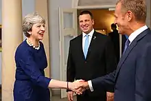 May triggered Article 50 of the Treaty on European Union to leave the EU in March 2017.[98][99] However, under her leadership, the government was unable to reach an EU withdrawal agreement approved by the Conservative Party as a whole. How to manage the border between Northern Ireland and the Republic of Ireland was a major problem; the so-called 'backstop'.[100]