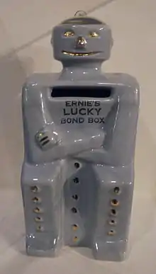 ERNIE is a hardware random number generator. The first ERNIE was built at the Post Office Research Station by a team led by Sidney Broadhurst. The designers were Tommy Flowers[10] and Harry Fensom and it derives from Colossus, one of the world's first digital computers.[11][12] It was introduced in 1957,[2] with the first draw on 1 June, and generated bond numbers from the signal noise created by neon tubes. The name is an acronym for Electronic Random Number Indicator Equipment. ERNIE 1 is in the collections of the Science Museum in London and was on display between 2008 and 2015.[12]
