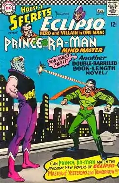 Although he longed to return to the peaceful paradise of Ra and Kranak's lovely dark-haired daughter Rimah, the bearded and brooding Ra-Man moved into the mansion, telling Elsa that Mark was dead, and vowed to continue his predecessor's work against the forces of evil. Riding around on his flying carpet-like six-sided green 'sun-disc' armed with his magic gem and an encyclopedic knowledge of black magic, he fought such arcane antagonists as the Heap (no relation to any of the other comic book creatures of the same name) and Lord Leopard and twice battled the evil Eclipso, another House of Secrets regular.[2][4][5] The "Prince Ra-Man" feature ended in House of Secrets #80 (September–October 1966).[6]