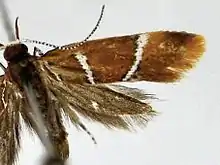 The wingspan is about 11.5-13.5 mm. The forewings are ochreous brown to ferrugineous. The costal margin black along the basal quarter. The markings are white edged with black scales. The hindwings and cilia are dark grey.[1]