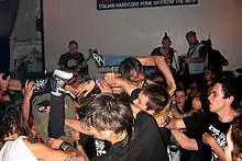 Some groups and individuals that self-identify as being a part of punk subculture hold right-wing views. The belief that such views are opposed to the original ethos of the punk subculture, and its history, has led to internal conflicts and an active push against such views being considered part of punk subculture at all. Two examples of this are an incident during the 2016 American Music Awards, where the band Green Day chanted anti-conservative, anti-racist, and anti-fascist messages,[21] and an incident at a show by the Dropkick Murphys, when bassist and singer Ken Casey, tackled an individual for giving a nazi-style salute and later stated that nazis are not welcome at a Dropkick Murphys show. Band member Tim Brennan later reaffirmed this sentiment.[22] The song "Nazi Punks Fuck Off" by hardcore punk band Dead Kennedys has come to be considered an anti-nazi anthem.[23]