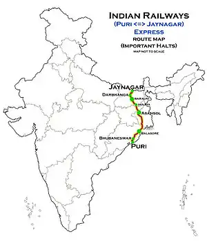 The 18419 / 20 Puri Jaynagar Express runs from Puri via Khurda Road Junction, Bhubaneswar, Cuttack Junction, Balasore, Adra Junction, Asansol Junction, Madhupur Junction, Barauni Junction, and Samastipur Junction to Jaynagar.