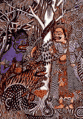 Ida Bagus Gelgel grew up in Kamasan, far away from direct western influence, but his works evolved beyond the conventions of the Wayang tradition. He was so creative, that in 1937 one of his paintings won a silver medal at the International Colonial Art Exhibition in Paris. One of his works, the Priest Dharmaswami, painted in 1935 using naturals dyes on paper, is one of the masterpieces of the Museum Puri Lukisan. It tells the story of a Priest who rescued a monkey, a snake and a tiger from a well. When the priest was arrested by a prince on false charges, the animals came to his rescue. The paintings shows these animals bringing gifts as a gratitude for saving their lives.