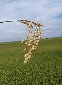 The genus Pyricularia includes species that are pathogenic on a wide range of monocot plants. For example, Pyricularia oryzae (sexual morph Magnaporthe oryzae), the causal agent of the rice blast disease, is one of the most widely distributed diseases of rice, and is highly destructive leading to up to 30% yield loss worldwide.[5] Pyricularia oryzae isolates from rice are mostly host-specific and infect only few host plants beside rice (barley and Lolium).[6][7][8][9] Pyricularia oryzae isolates from other host plants such as Eleusine, Setaria and Triticum are also host-specific, and unable to infect rice.[7][8][4][9] The closely related species P. oryzae and Pyricularia grisea are indistinguishable in morphology of conidium, perithecium and ascopore. Pyricularia grisea isolates from Digitaria were shown to form a distinct clade by phylogenetic analysis[7][10][11][12][13] and infect crabgrass (Digitaria), but not other hosts.[7][14][15][16] However, some P. oryzae isolates from rice and other grasses and some P. grisea isolates from crabgrass were described to show cross-infectivity on crabgrass and rice, respectively.[13]