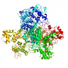 ![]() Crystallographic structure of pyruvate dehydrogenase (PDH). PH is a six domain dimer with α (blue), α’ (yellow), β (red), and β’ (teal) regions denoted by the different colors. Thiamine pyrophosphate (TPP) is shown in grey ball and stick form, two magnesium ions in purple undergoing metal ligation with the TPP, and two potassium ions in orange.[1] | |||||||||