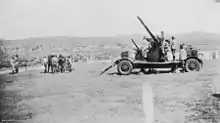 Beginning in 1930, a new towed 4-wheeled sprung trailer platform was introduced to replace the obsolete lorries still used as mounts from World War I, together with modern new barrels, and equipment to connect the guns to the new Vickers No. 1 Predictor.[12] 8 more Mks followed between the World Wars.[1] By 1934 the rocking-bar deflection sights had been replaced by Magslip receiver dials which received input from the Predictor, with the layers matching pointers instead of tracking the target.[13] Predictor No. 1 was supplemented from 1937 by Predictor No. 2, based on a US Sperry AAA Computer M3A3. This was faster and could track targets at 400 mph (640 km/h) at heights of 25,000 ft (7,600 m), both Predictors received height data, generally from the Barr & Stroud UB 7 (9 feet base) instrument.[14]