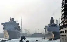 - "QE2 sounds her whistle to Queen Mary 2 in Dubai".
