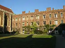 President's Lodge of Queens' is the oldest building on the river at Cambridge (ca. 1460).[9] The President's Lodge sits in Cloister Court: the Cloister walks were erected in the 1490s to connect the Old Court of 1448/9 with the riverside buildings of the 1460s, thus forming the court now known as Cloister Court. Essex Building, in the corner of the court, was erected 1756–60, is so named after its builder, James Essex the Younger (1722–1784), a local carpenter who had earlier erected the wooden bridge.