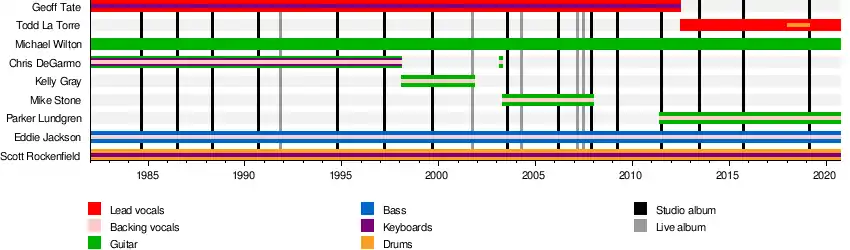 Queensrÿche /ˈkwiːnzraɪk/ is an American heavy metal band. It formed in 1980 in Bellevue, Washington, out of the local band the Mob.[1] The band has released 15 studio albums, one EP, and several DVDs, and continues to tour and record. The original lineup consisted of guitarists Michael Wilton and Chris DeGarmo, drummer Scott Rockenfield, bassist Eddie Jackson, and lead vocalist Geoff Tate.