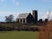 To this day, within easy view of the airfield, is the (still) stunted tower of the parish church of St. Andrew (in Manx Gaelic, Andrew translates to Andreas), a permanent legacy of Royal Air Force Station Andreas, and below which lie twenty-three military graves.[12][41]