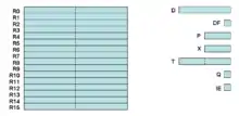An important feature of the 1802 is the register design of sixteen registers of 16 bits each. Using the SEP instruction, you can select any of the 16 registers to be the program counter; using the SEX instruction, you can select any of the 16-bit registers to be the index register.[41] Register R0 has the special use of holding the memory address for the built-in DMA controller. Register R1 has the special use of being the program counter for the interrupt handler.[42]