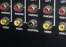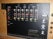 One of the main features of the Dimensia's was the large input/output panel on the back. This included several RCA composite video terminals as well as multiple unbalanced and balanced RF antenna/cable inputs. This enabled easy connection of all Dimensia system components, each on their own channel. Additionally, the RCA cables were able to be connected piggy-back, resulting in daisy-chain wiring. The components were also connected to the control bus data link via the same piggy-back style RCA connectors. All Dimensia-Intelligent components could interact with the monitor's built-in computer. The first generation console Dimensia I/O panel shown to the left also has a SCART interface, an early multiport A/V interface which was popular in Europe (called EIA Multiport-Stereo Connector by RCA).[4]