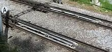 The geometry of the rack system has a large impact on the construction of turnouts. If the rack is elevated above the running rails, there is no need to interrupt the running rails to allow passage of the driving pinions of the engines. Strub explicitly documented this in his U.S. patent.[13] Strub used a complex set of bell-cranks and push-rods linking the throw-rod for the points to the two throw-rods for the moving rack sections. One break in the rack was required to select between the two routes, and a second break was required where the rack rails cross the running rails. Turnouts for the Morgan Rack system were similar, with the rack elevated above the running rails. Most of the Morgan turnout patents included movable rack sections to avoid breaks in the rack,[17][20] but because all Morgan locomotives had two linked drive pinions, there was no need for a continuous rack. So long as the breaks in the rack were shorter than the distance between the drive pinions on the locomotive, the rack rail could be interrupted wherever there was need to cross over a running rail.[15]