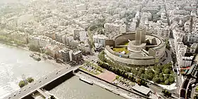 Radio France has its headquarters at the Maison de la Radio, a circular building designed by the architect Henry Bernard (architect) and inaugurated in December 1963 by President Charles de Gaulle, which stands beside the River Seine in the 16th arrondissement of Paris. In addition to housing Radio France's central services and the studios of several of its channels, the building is home to the Musée de Radio France, a museum of radio and television broadcasting and recording techniques. The building caught fire in October 2014.[2]