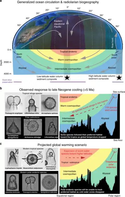Data show that some species were extirpated from high latitudes but persisted in the tropics during the late Neogene, either by migration or range restriction (b). With predicted global warming, modern Southern Ocean species will not be able to use migration or range contraction to escape environmental stressors, because their preferred cold-water habitats are disappearing from the globe (c). However, tropical endemic species may expand their ranges toward midlatitudes. The color polygons in all three panels represent generalized radiolarian biogeographic provinces, as well as their relative water mass temperatures (cooler colors indicate cooler temperatures, and vice versa).[13]